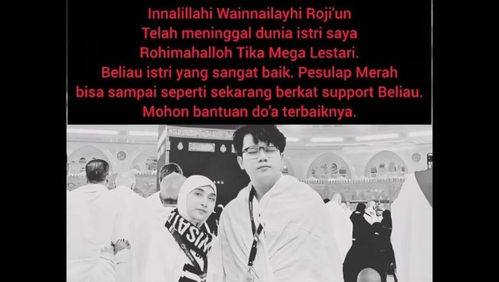 Marcel Radhival atau yang populer dengan nama Pesulap Merah tengah berduka atas meninggalnya sang istri, Tika Mega Lestari, pada Selasa (27/1/2026). Tika mengembuskan napas terakhirnya di rumah sakit setelah berjuang melawan penyakit yang dideritanya sejak lama.